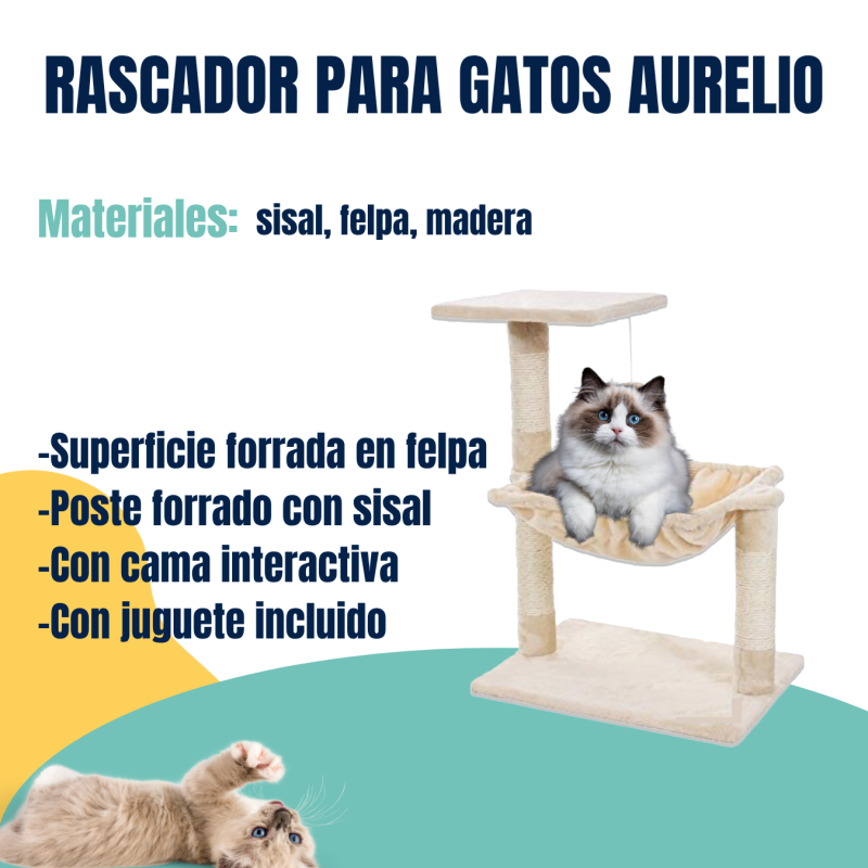 Caracteristicas: -) Medidas: 50X36X70 cm -) Con superficie forrada en felpa -) Poste forrado con cuerda de sisal natural -) Con Camita interactiva -) Juguete incluido