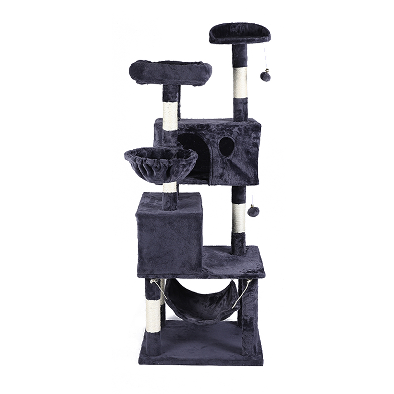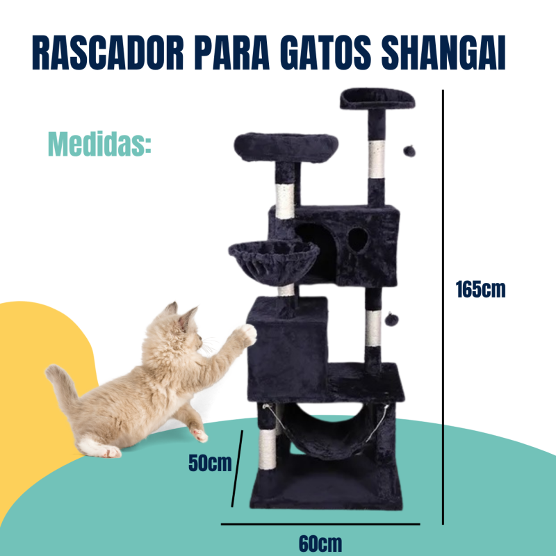Caracteristicas: -) Medidas: 60X50X165CM -) Con superficie forrada en felpa -) Poste forrado con cuerda de sisal natural -) Con Caja y cuevas -) Con Juguete interactivo -) Con Hamaca -) Es la opción ideal para departamentos